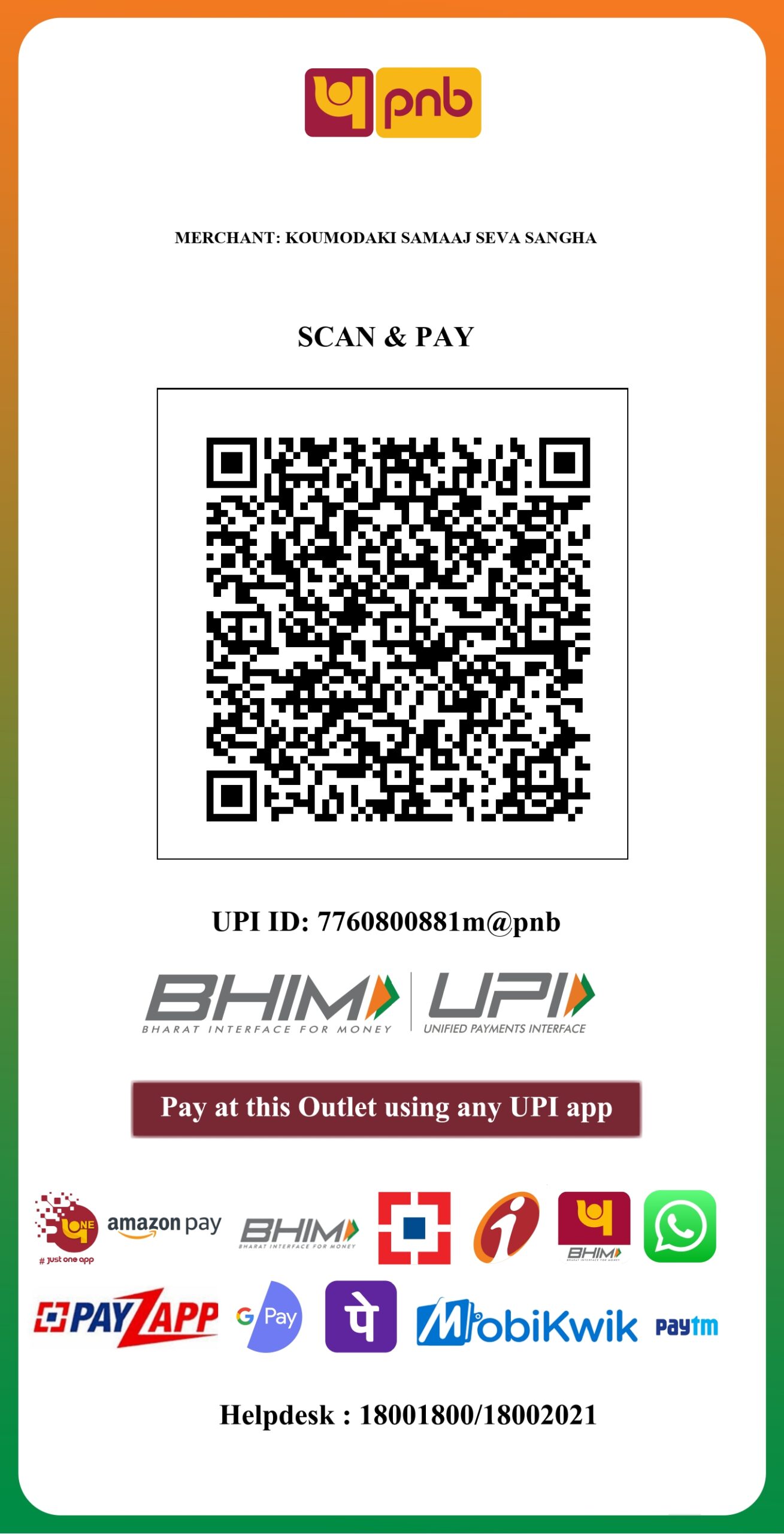 Name: KOUMODAKI SAMAAJ SEVA SANGHA Account number: 1842100100014855 IFSC: PUNB0184210 Bank name: Punjab National Bank Branch: BANGALORE NELAMANGALA